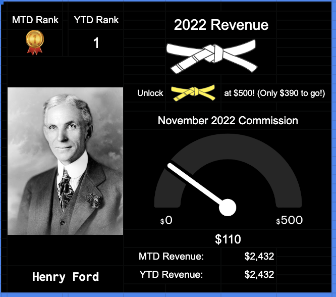 Track your and other advisors commissions. Medals, belts, ranks, gauge, pictures – everything you need + more!